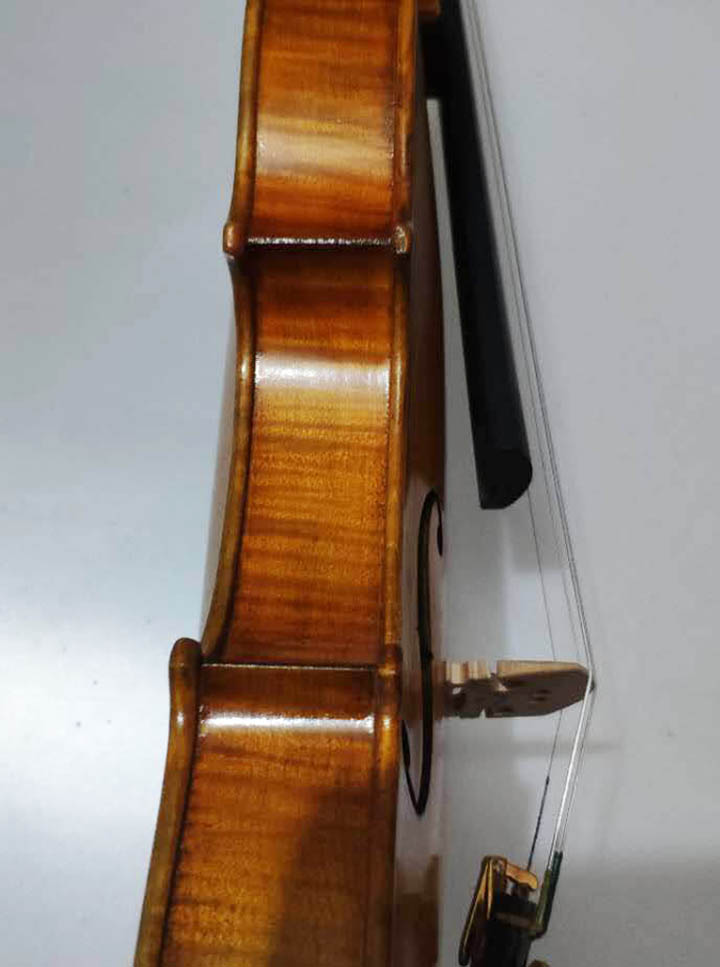 描述:正如大家所看到的的一樣,這把琴有著非常美觀的外形,這取決于它的選材和油漆,背板的花紋看上去非常的自然和諧,面板木紋之間的距離都在2毫米左右;采用亮光的酒精漆,防舊復古的風格更是賦予了這把琴以神秘感。這把琴雖然看上去很硬,但聲音確是非常的柔美,堪稱是一把非常不錯的演奏級小提琴。
