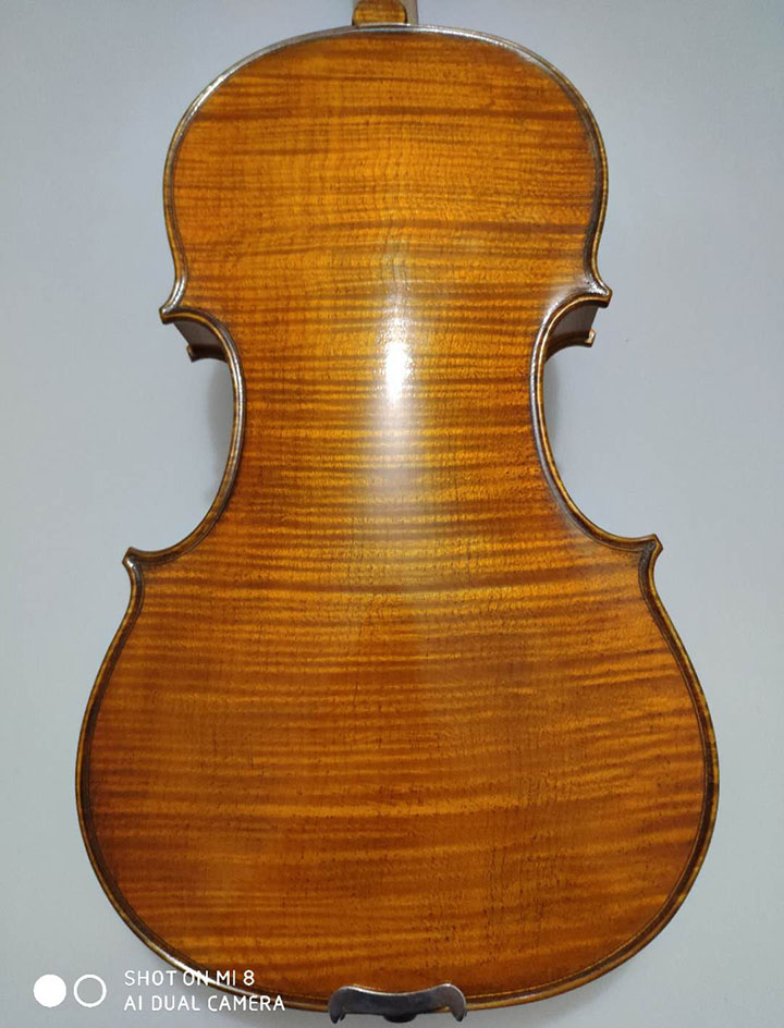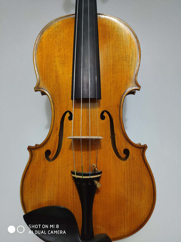 八年以上自然風干,面板年輪均勻,背板花紋美觀,市場上幾乎稀少,由有著20年經驗的制琴師親自制作,15道手工油漆,該琴發音輕快、有力,低音渾厚,高音區發音流暢,該琴是樂團、樂隊專業演奏員理想的用琴。